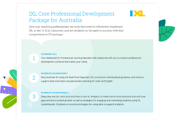 The IXL Core PD Package is designed to give you everything you need for an effective implementation. Your teachers will learn best practices for using the Real-Time Diagnostic, IXL curriculum and Recommendations to support daily teaching and personalise learning.